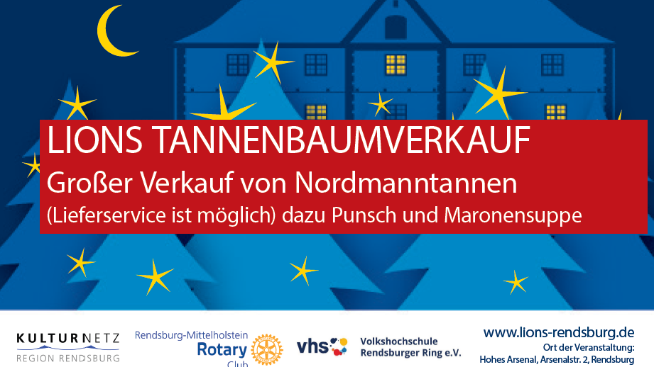 Das hat schon Tradition: jährlich organisiert der Lions Club Rendsburg einen Tannenbaumverkauf im Innenhof des Hohen Arsenals für den guten Zweck. Die hochwertigen Nordmanntannen gibt es in allen gewünschten Größen und Breiten. Nach der Auswahl kann man sich den Baum selbstverständlich für den eigenen Transport nach Hause einnetzen lassen. Alternativ wird ein Lieferdienst am selben Tag angeboten. Dazu gibt es wie in jedem Jahr Punsch und die heiß begehrte Maronensuppe. Der Erlös kommt der musikalischen Förderung von Kindern und Jugendlichen in Rendsburg zugute.